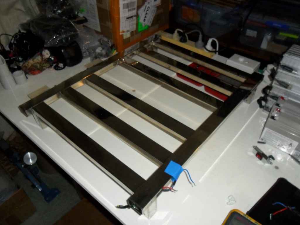 Rectangular stainless tube, welded. Heating wire threaded through tubes. Mains entry and switch, bottom right.